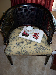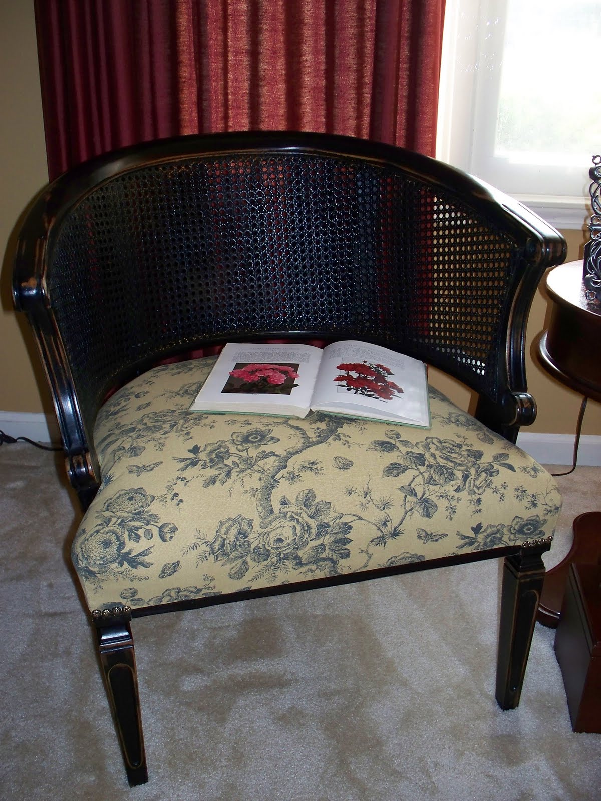 Then I lightly distressed it and waxed it with Minwax special dark and recovered it in a floral toile fabric I found at Hobby Lobby.