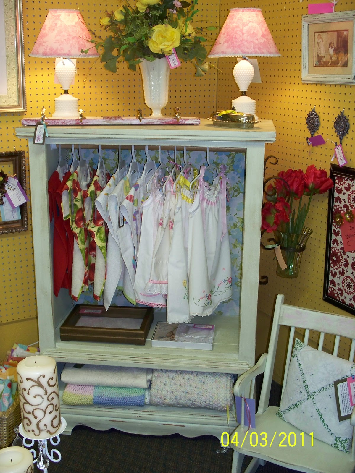 I am SUPER excited about our new display armoire.  This was given to me by my friend Susan.  It was headed to her trash (this would have been a sin).  It used to be a chest of drawers.  Her neighbor had converted into a 2 shelf TV cabinet (quite crafty I must say), but it was very rough!  My friend Susan had primed it (thank you…saved me an hour plus step), which she had planned to use it for a TV cabinet as well, but I never made it passed her garage.  So that’s when she called me. YEAH for me!   We happily brought it home…not really knowing what we would do with it at the time.  Then the wrath of excitement hit.  It would be our new armoire for the booth!  My husband removed another shelf and did quite a bit of sanding.  Did I mention he did some sanding? Then it was my turn to get me hands on it.  Painted, antiqued and then distressed….Oh and we added a piece of wood covered in vintage sheet fabric to the back to dress it up (and hide the hole that had been cut in the back for the TV cord).  I think it turned out great, especially for FREE!