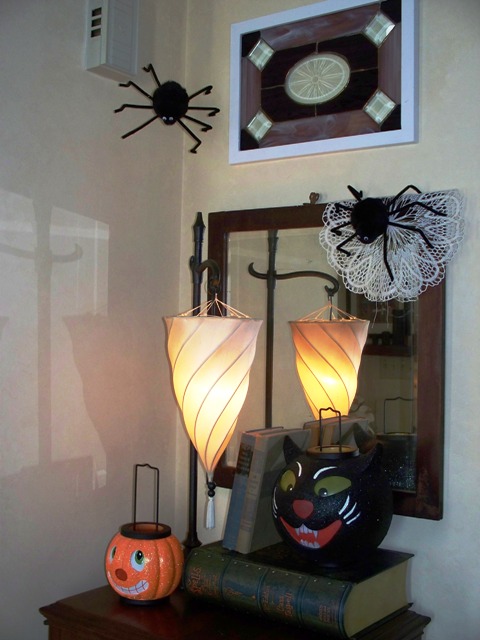 | This is our front entry! Fred on his web and Herman hanging near by. The cat and the pumpkin are luminaries from Illuminations. I miss that store, they had the best seasonal decor. |