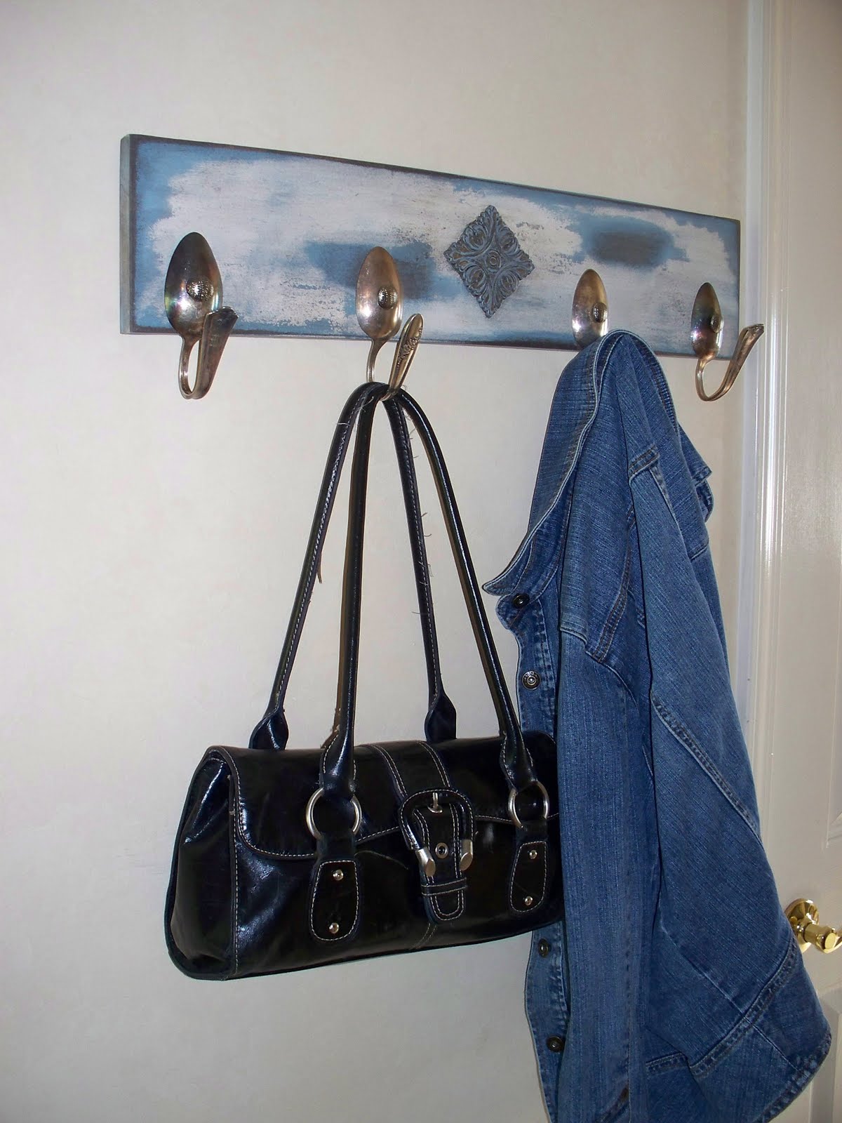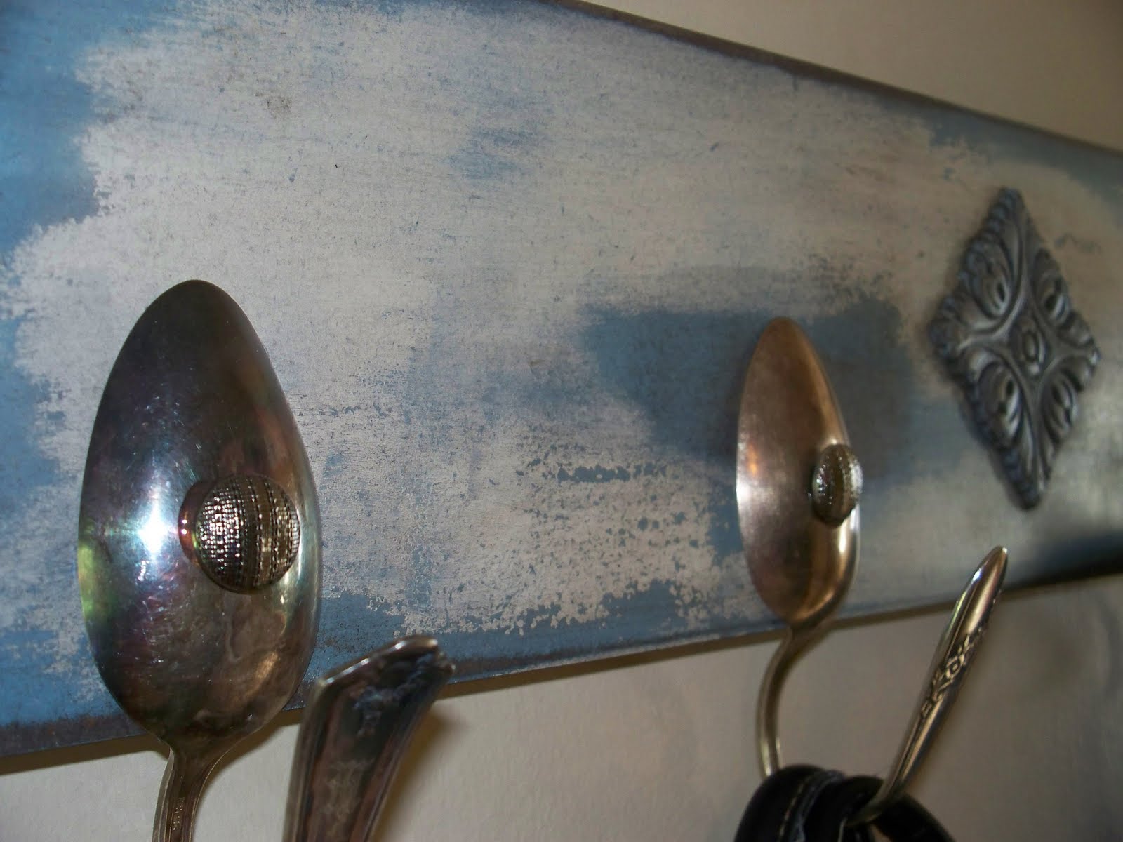 The spoon rack is made from silver plated vintage spoons bent into the shape of a hook. I made one of these for the booth before Christmas…it never made it to the booth! SHHH! I kept if for myself and I am glad I did. We use it ALL THE TIME! It’s never empty and has been one of the best things we added to our entry way. I made 2 for Christmas gifts and they were a huge hit with my sister-in-law and step mother. I have made a couple of other with smaller spoon hooks for the booth, but hadn’t made a large one like the one I kept. I finally had enough serving spoons to make another one to sell.