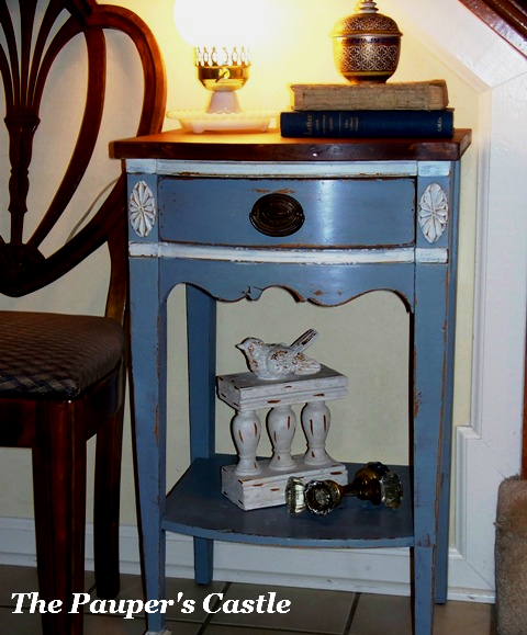 I thought this piece needed something a little more refined.  So I sanded the top so I could stain it and painted the body with Slate Old Fashioned Milk Paint WITH the Extra-Bond added. I did NOT sand or prime this piece.  I simply cleaned it with TSP-PF and then painted. It took ONE coat of paint.  Then I painted the details with one coat of Light Cream OFMP (I did NOT mix in the Extra-Bond with this; it’s only needed in the first coat).  I lightly sanded by hand and then waxed the entire piece with a natural colored wax.  The entire project took LESS than 3 hours from start to finish.  I think the results are FABULOUS….What do you think?