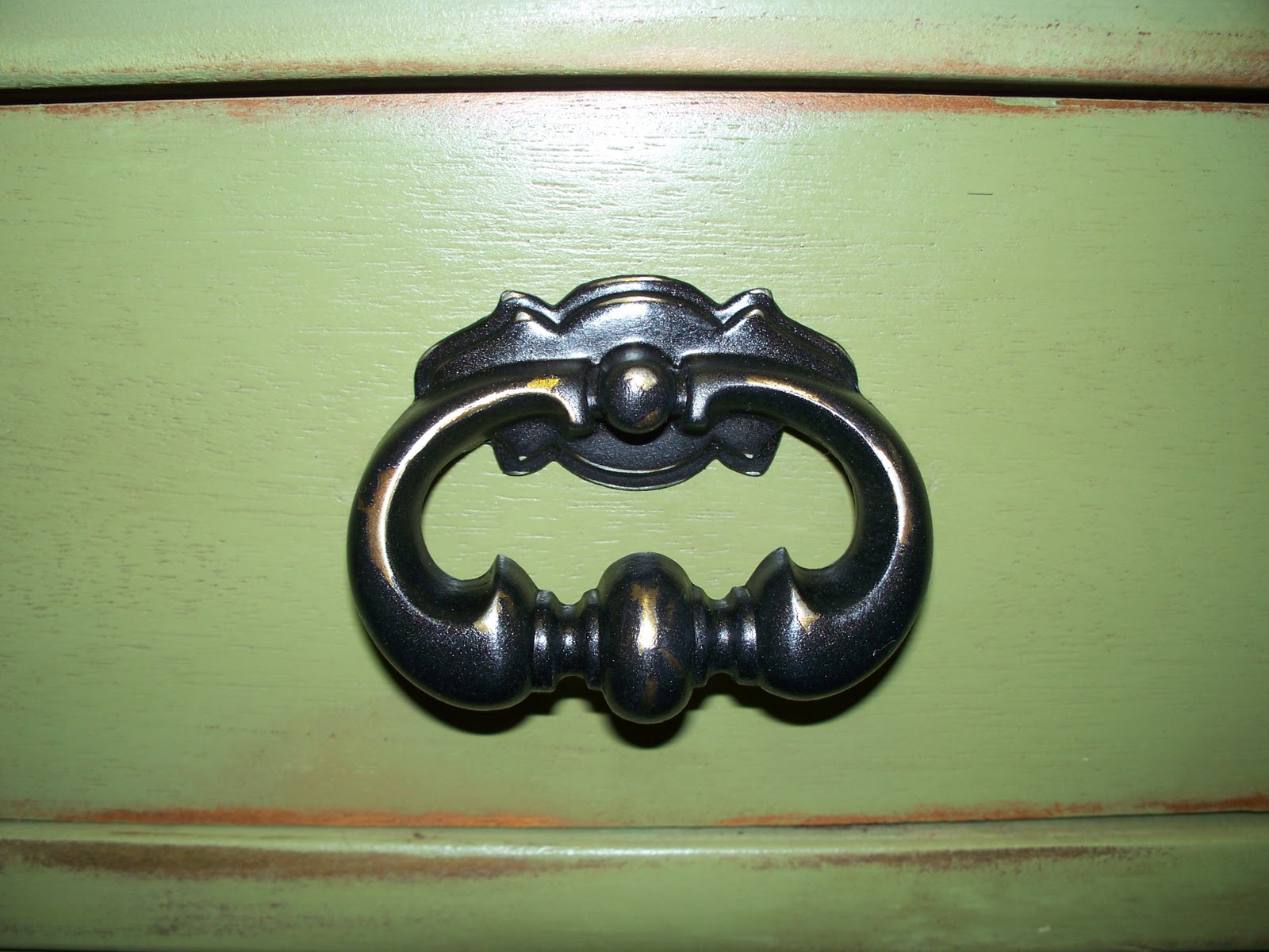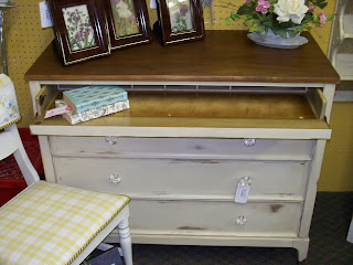 | No staged vanity shots here, just raw, straight from the booth photo! However, I love the way this turned out. To see the before pictures visit my Treasures Abound Post. This took quite a bit of work since the original hardware was counter sank into the edge of the drawers. Lots of filling and sanding. I left the inside the the desk drawer in it’s original finish. It had a nice leather inset for writing. Painting would have been too difficult and I didn’t want to remove the leather inset. We replaced the handles with cut glass handles that Mr. T did a wonderful job with his precise measuring to get them placed perfectly. |